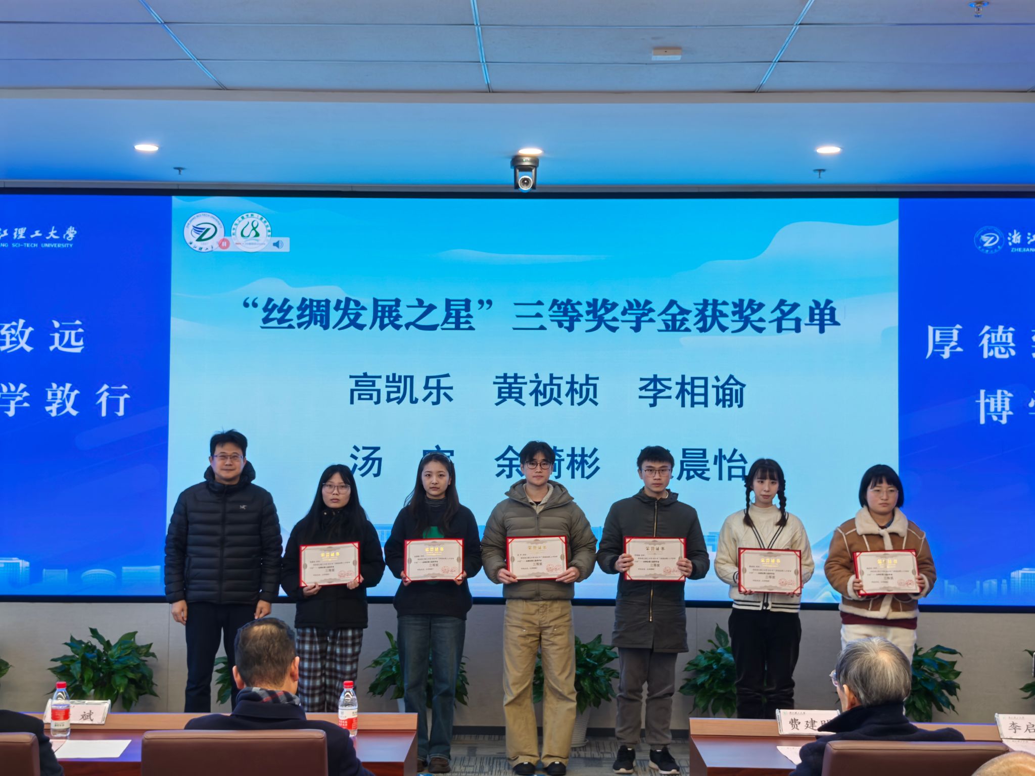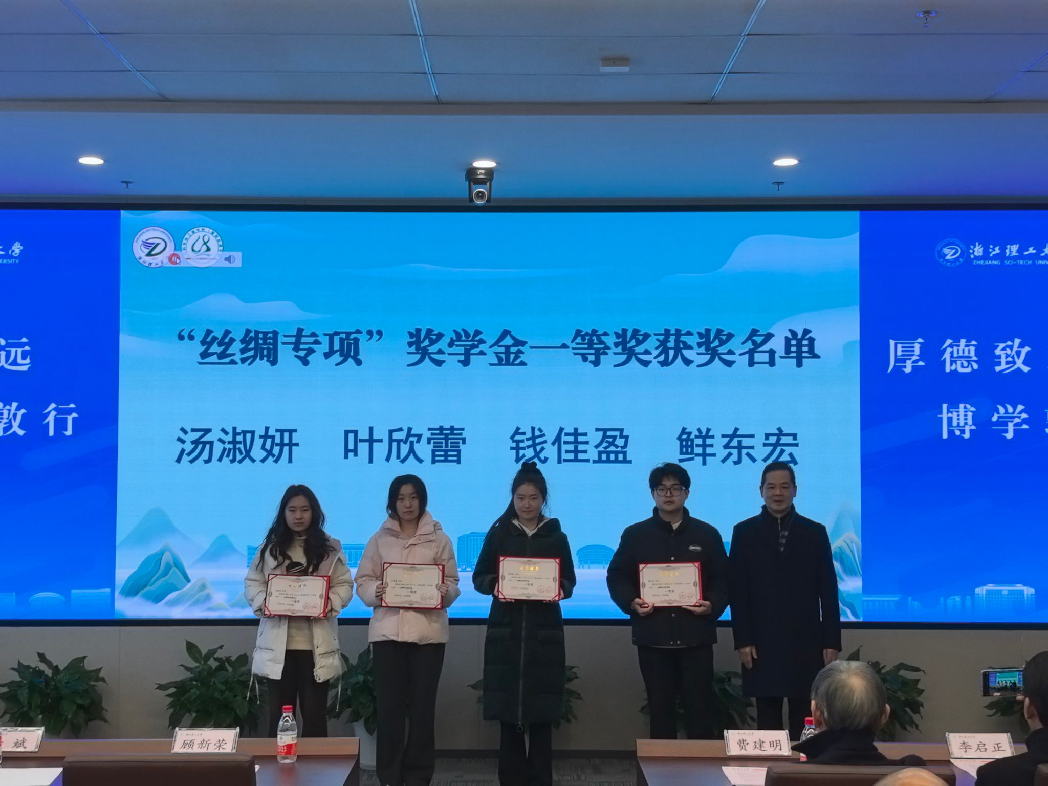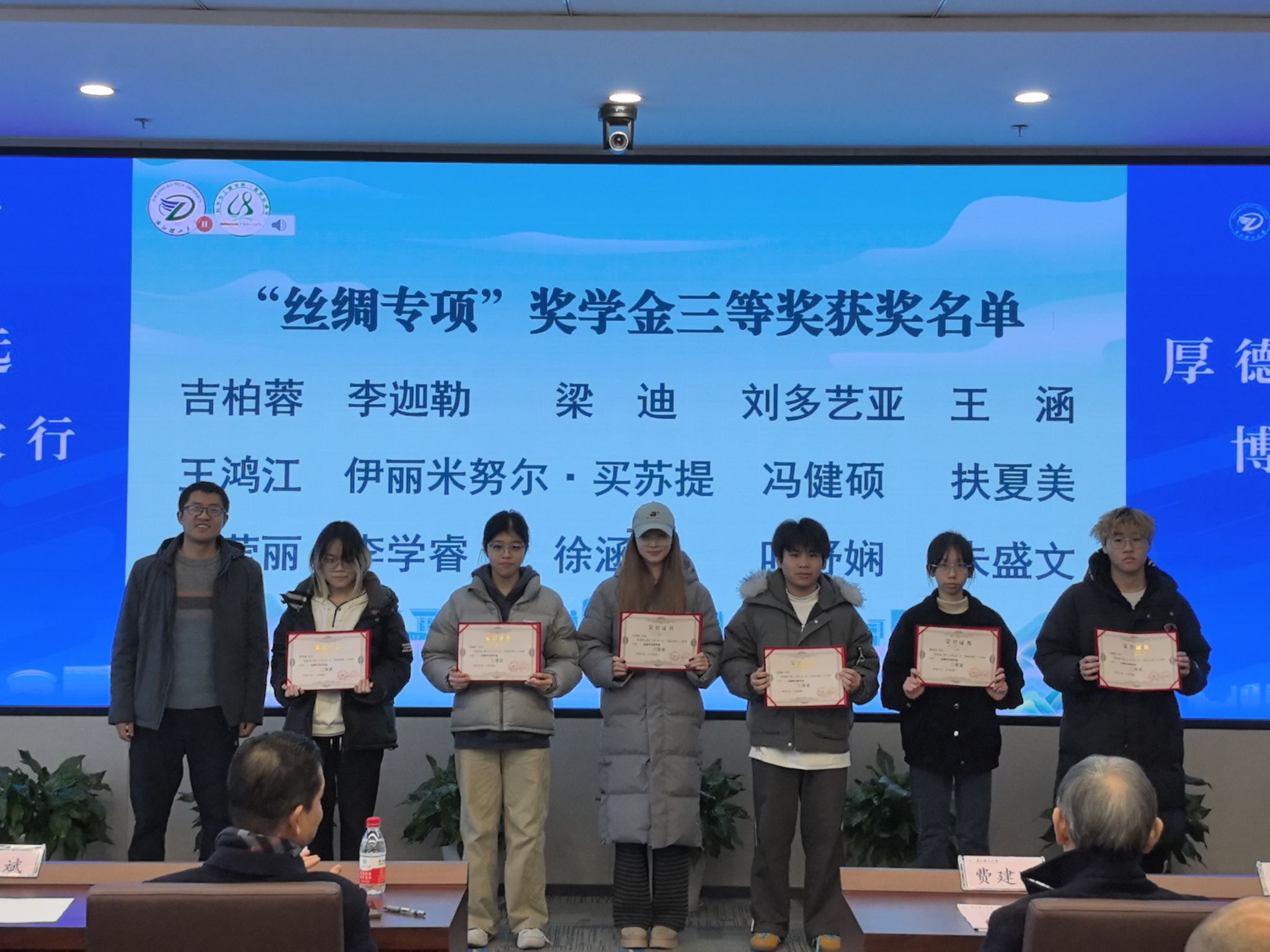 在热烈的掌声中,“美丽丝绸”奖学金颁奖仪式正式举行。本届奖学金设“丝绸发展之星”和“丝绸专项”两个类别,共有38名优秀本硕博学生获奖。